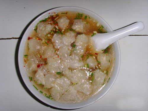 初闻清汤,理所当然的以为是餐桌上的一道汤,定然味道鲜美而很少油腻.但到了五都,方知南辕北辙闹了个大笑话,五都清汤是一种点心,一种非常美味可口的点心!很多人吃过小馄饨,无不被她晶莹剔透的皮子、鲜美无比的肉馅、柔嫩滑爽的口感所折服,但和清汤相比则是小巫见大巫了。清汤的皮手工干制,薄如纸翼;清汤的馅用刀背捶打出来。大师傅左手捏皮,右手拿一支竹片,蘸点肉馅,只见竹片飞扬,双手翻动,眼花缭乱之际,肉馅已和皮子混为一体,成了一个个小而又小的清汤。放在汤锅里一滚,即起锅,盛入碗里,撒上葱花,最后点缀一点猪油和香油,这色、这香、这味怎不令人神往!更何况,一碗四十个,那不就是一件精美的艺术品吗...